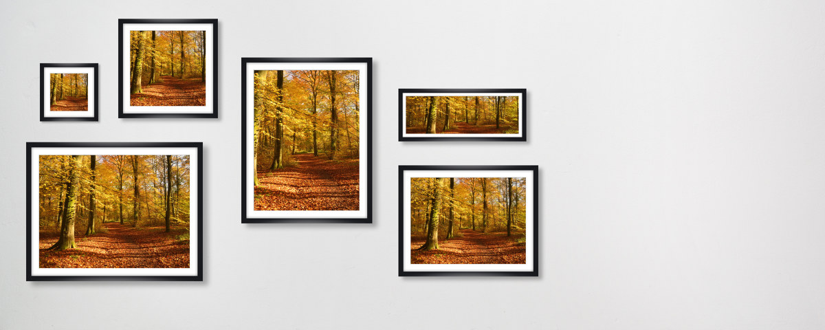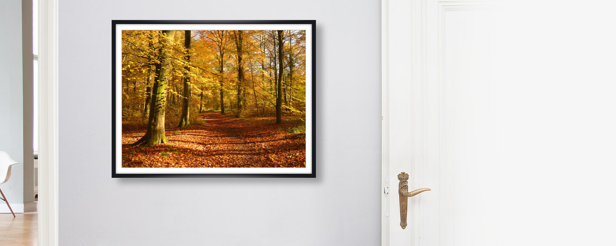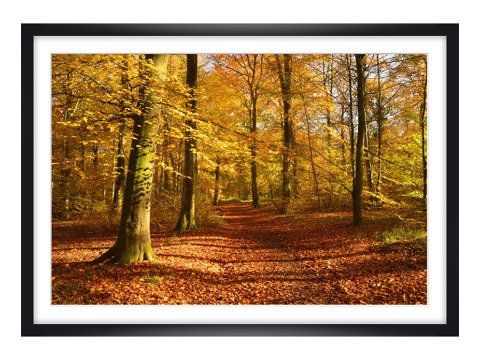 Herbstwald im weißen Holzrahmen. Setzen Sie Ihr neues Lieblingsmotiv dezent in Szene - wahlweise mit und ohne Passepartout.